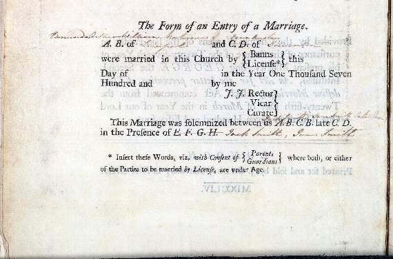 Located within the Steventon marriage register for 1755-1812, Jane Austen’s hand-written notes appear in the specimen entries at the front of the book. The register not only reveals a fictitious entry for the publication of banns – a proclamation of marriage – between Henry Frederic Howard Fitzwilliam of London, and Jane Austen of Steventon, but also a fictitious entry for the marriage of Edmund Arthur William Mortimer of Liverpool and Jane Austen of Steventon.